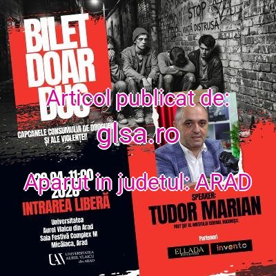 Universitatea „Aurel Vlaicu” din Arad va găzduimiercuri, 29 aprilie 2026, de la ora 11:00, în Sala Festivă Complex M, Micălaca, evenimentul „Bilet doar dus – Capcanele consumului de droguri și ale violenței”, dedicat conștientizării riscurilor asociate consumului de substanțe interzise și comportamentelor violente.