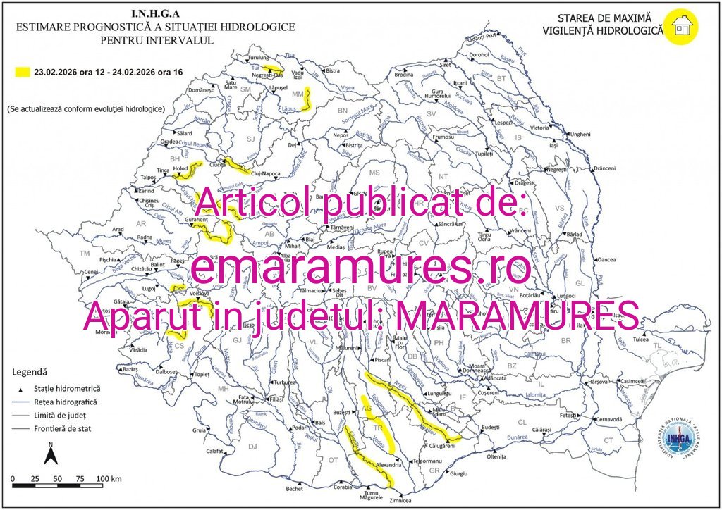 COD GALBEN pentru intervalul 23 februarie ora 12:00 și 24 februarie ora 16:00 pe râurile din bazinele hidrografice: Tur – bazin amonte Ac. Călineşti-Oaş şi afluenţii aferenţi sectorului aval Ac. Călineşti-Oaş (judeţul Satu Mare),Lăpuş – bazin superior şi afluenţi bazin mijlociu şi inferior (judeţul Maramureş), Crişul Repede – bazin amonte S.H. Ciucea şi afluenţii aferenţi sectorului aval S.H. Ciucea – amonte S.H. Vadu Crişului (judeţele: Cluj şi Bihor), Crişul Negru – bazin amonte S.H. Beiuş şi afluenţii aferenţi sectorului aval S.H. Beiuş – amonte S.H. Tinca (judeţul Bihor), Crişul Alb – bazin amonte S.H. Gurahonţ şi afluenţii aferenţi sectorului aval S.H. Gurahonţ – amonte S.H. Ineu (judeţele: Hunedoara şi Arad), Arieş – bazin amonte S.H. Câmpeni şi afluenţii aferenţi sectorului aval S.H. Câmpeni – amonte S.H. Baia de Arieş (judeţul Alba), Timiş – bazin amonte S.H. Sadova şi afluenţii aferenţi sectorului aval S.H. Sadova – amonte S.H. Lugoj (judeţele: Caraş Severin şi Timiş), Călmăţui (judeţele: Olt și Teleorman), Vedea – afluenţii aferenţi sectorului aval S.H. Văleni – amonte confluenţă cu râul Teleorman (judeţele: Olt, Teleorman şi Argeş), Argeş – afluenţii aferenţi sectorului aval S.H. Malu Spart – amonte S.H. Budeşti (judeţele: Argeș, Dâmboviţa, Teleorman, Giurgiu şi Ilfov).