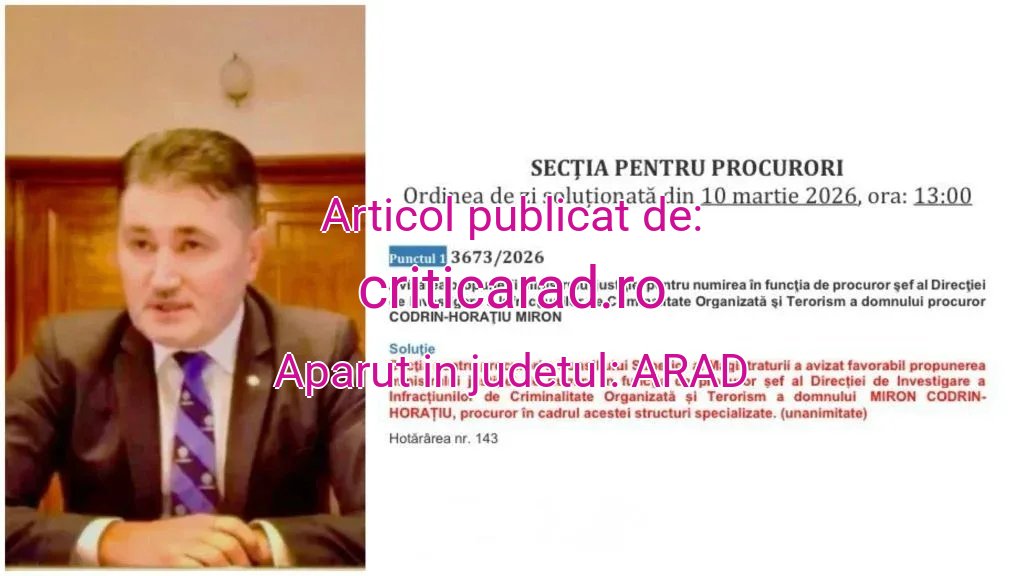 Procurorul Codrin Horațiu Miron, actualul șef al DIICOT Timișoara, a primit marți, 10 martie 2026, aviz favorabil unanim din partea Secției pentru procurori a Consiliului Superior al Magistraturii (CSM) pentru numirea în funcția de procuror-șef al Direcției de Investigare a Infracțiunilor de Criminalitate Organizată și Terorism (DIICOT). Votul a fost de 6și 0.