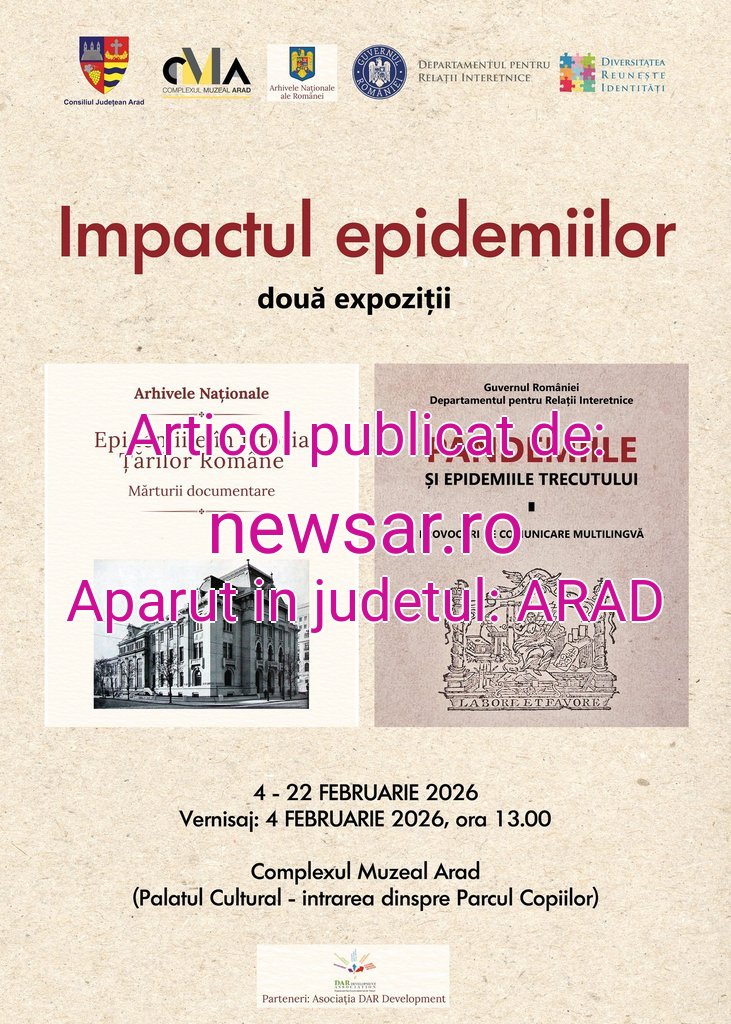 Complexul Muzeal Arad, în parteneriat cu Arhivele Naționale ale României și Asociația Dar Development, cu sprijinul Departamentului pentru Relații Interetnice (DRI) din cadrul Secretariatului General al Guvernului, organizează două expoziții tematice dedicate impactului epidemiilor: „Epidemiile în istoria Țărilor Române. Mărturii documentare” și „Pandemiile și epidemiile trecutului. Provocări de comunicare multilingvă”.