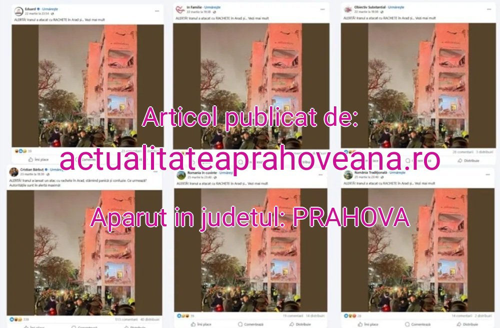 „ALERTĂ! Iranul a atacat cu RACHETE în Arad și…” este, de exemplu, știrea publicată în 22 martie pe mai multe site-uri și ilustrată cu imaginea unei clădiri puternic avariate lângă care se află un echipaj de intervenție care pare că încearcă să liniștească mulțimea. În fapt, este vorba despre orașul Arad din sudul Israelului, ținta unora dintre cele mai devastatoare atacuri ale Iranului din ultimele săptămâni. Imaginea folosită de aceste pagini pare să fi fost preluată din presa israeliană, fără citarea sursei, în ziua atacului, notează G4media , iar știrea a fost demontată chiar din prima zi.