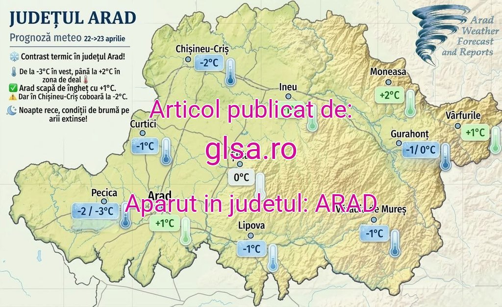 În Vestul județului temperaturile scad sub pragul de îngheț. La Pecica sunt estimate minime de -2…-3°C, iar la Chișineu-Criș în jur de -2°C.